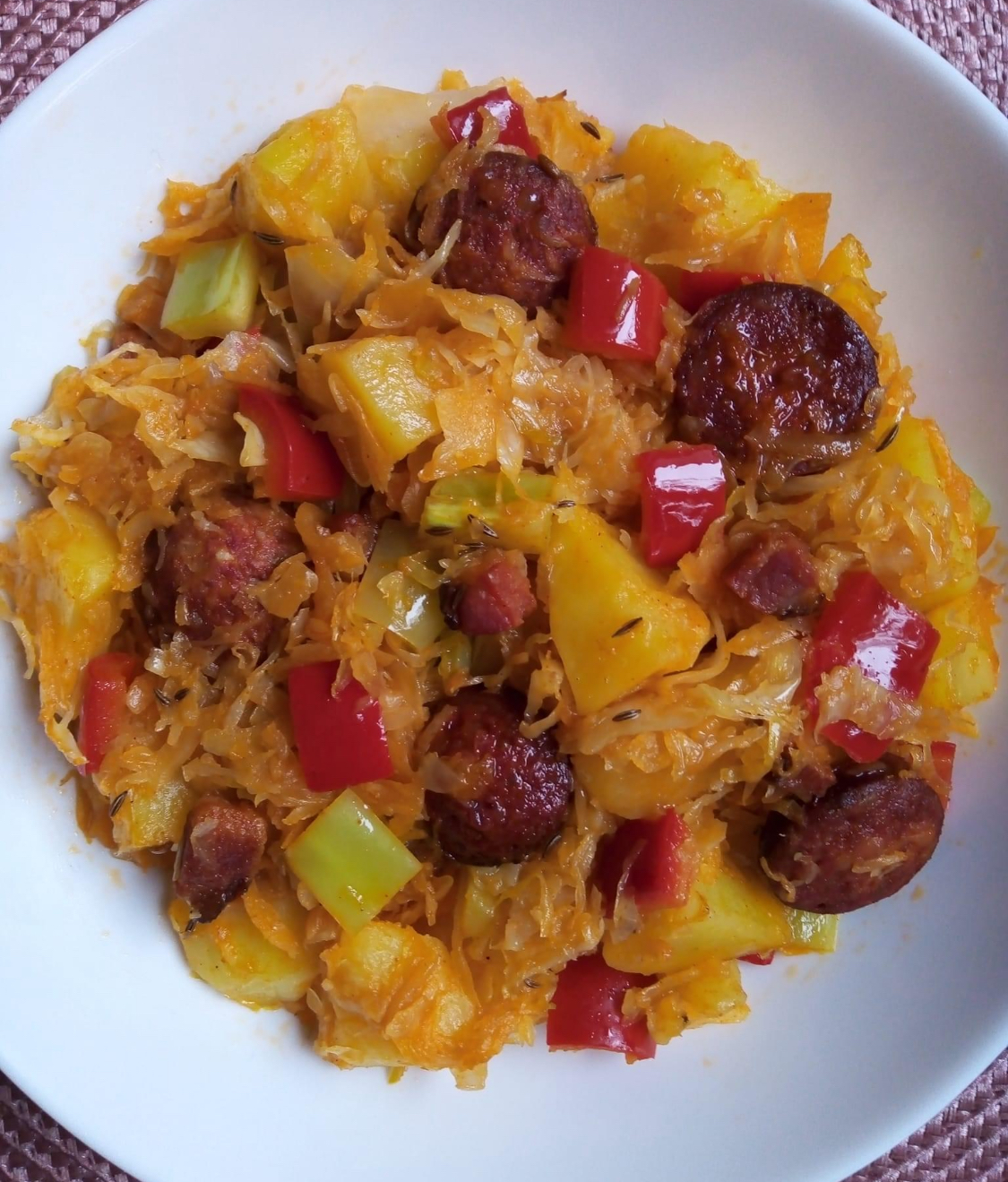 Tradičné slovenské jedlo z uvarených zemiakov, kyslej kapusty, klobásky a slaninky.