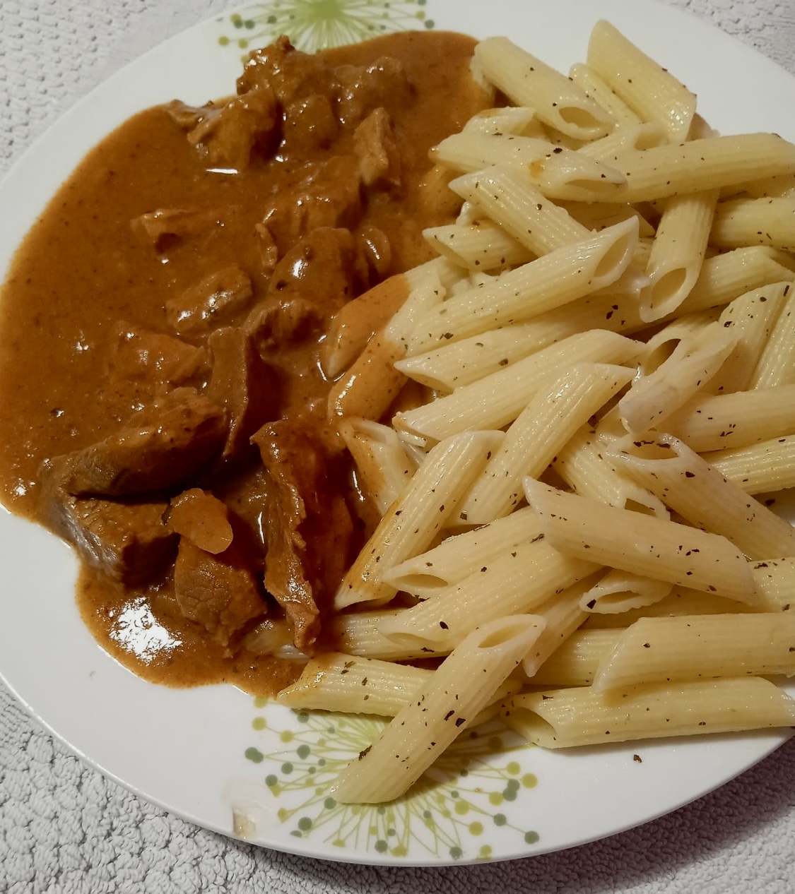 Tradičný slovenský guláš z bravčového pliecka s cibuľou a paprikou.