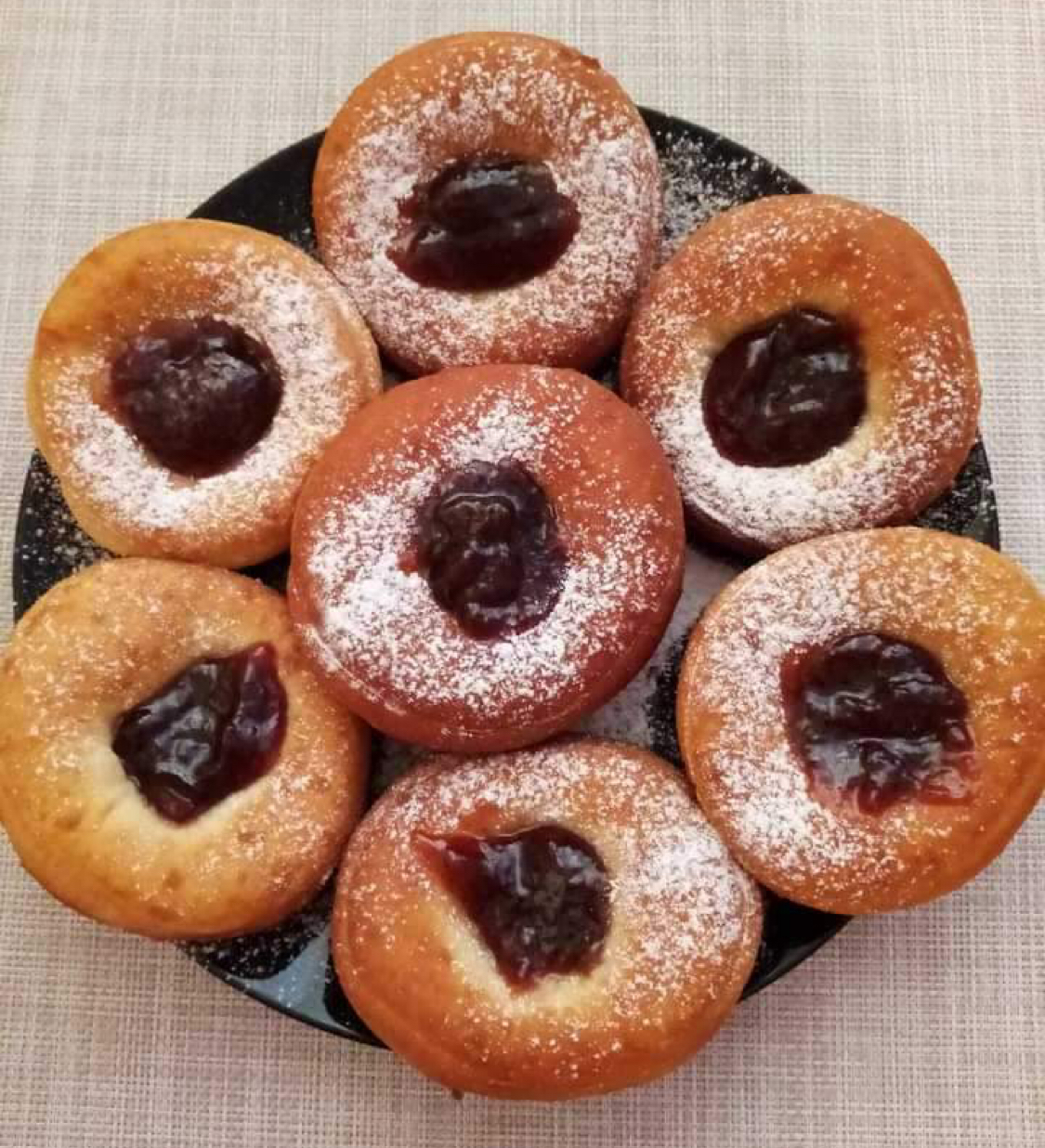 Hotové šišky si naplníme džemom a posypeme práškovým cukrom