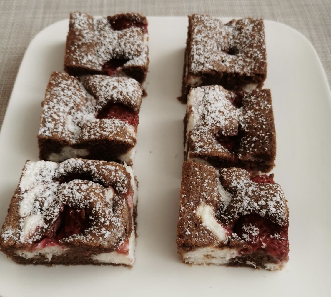 Delikátny koláč s tvarohovo-kokosovou náplňou a jahodami.
