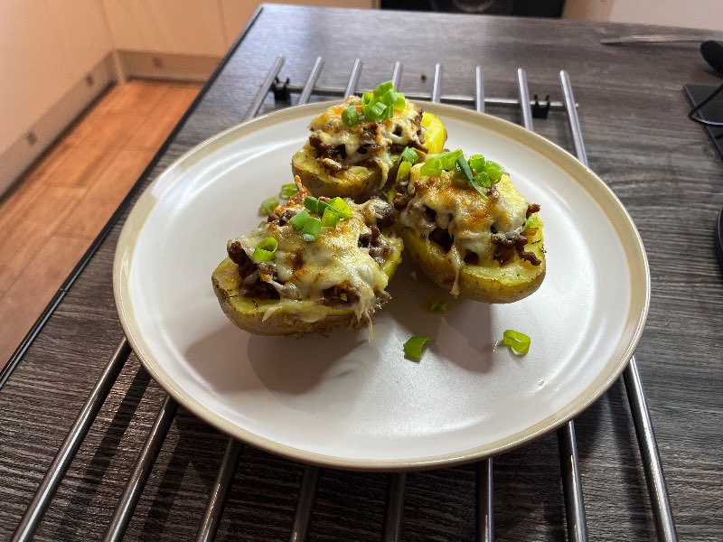 Chutné zemiaky plnené pikantným hovädzím mäsom s čedarom a kajenským korením.
